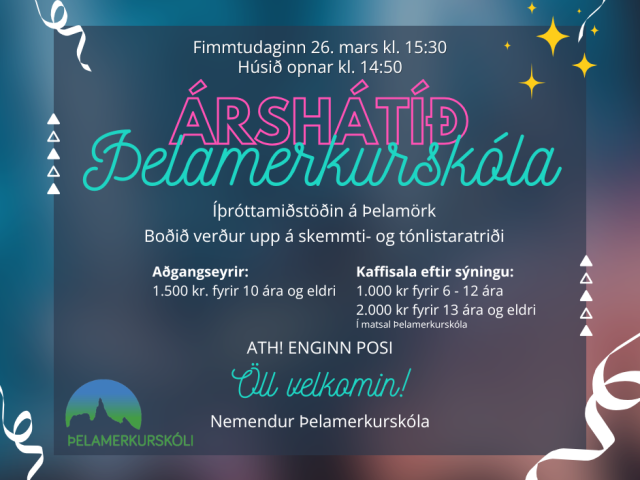 Árshátíð Þelamerkurskóla verður haldin fimmtudaginn 26. mars næstkomandi í Íþróttamiðstöðinni á Þelamörk. Húsið opnar kl. 14:50 og dagskrá hefst kl. 15:30.