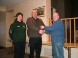 Á myndinni er Doddi að afhenda Braga og Evu lyklana að félagsheimilinu.