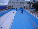Eftir örfáa daga lýkur umfangsmiklum endurbótum á sundlauginni á Þelamörk sem staðið hafa síðan í lok júní. Frágangi á sundlaugarkerinu sjálfu er lokið, á myndinni sést þegar verið var að setja dúk innan í kerið áður en snjórinn kom í síðustu viku. Flísalögn á heitum pottum mun ljúka í næstu viku, og þá verður hægt að taka sundlaugina aftur í notkun.