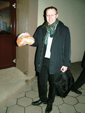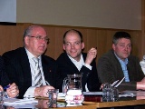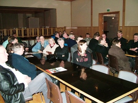 Á myndinni hér fyrir ofan eru oddvitar Arnarneshrepps og Hörgárbyggðar, Axel Grettisson og Helgi Steinsson, ásamt Kristjáni L. Möller. Hér fyrir neðan er mynd af hluta fundarmanna á seinni fundinum og svo er mynd af Hermanni Sæmundssyni eftir að hafa verið leystur út með kleinupoka til að fara með í ráðuneytið, en ráðherrann hrósaði kleinunum sérstaklega. Þær voru bakaðar af félagskonum í Kvenfélagi Hörgdæla sem sáu um veitingarnar á kynningarfundunum.